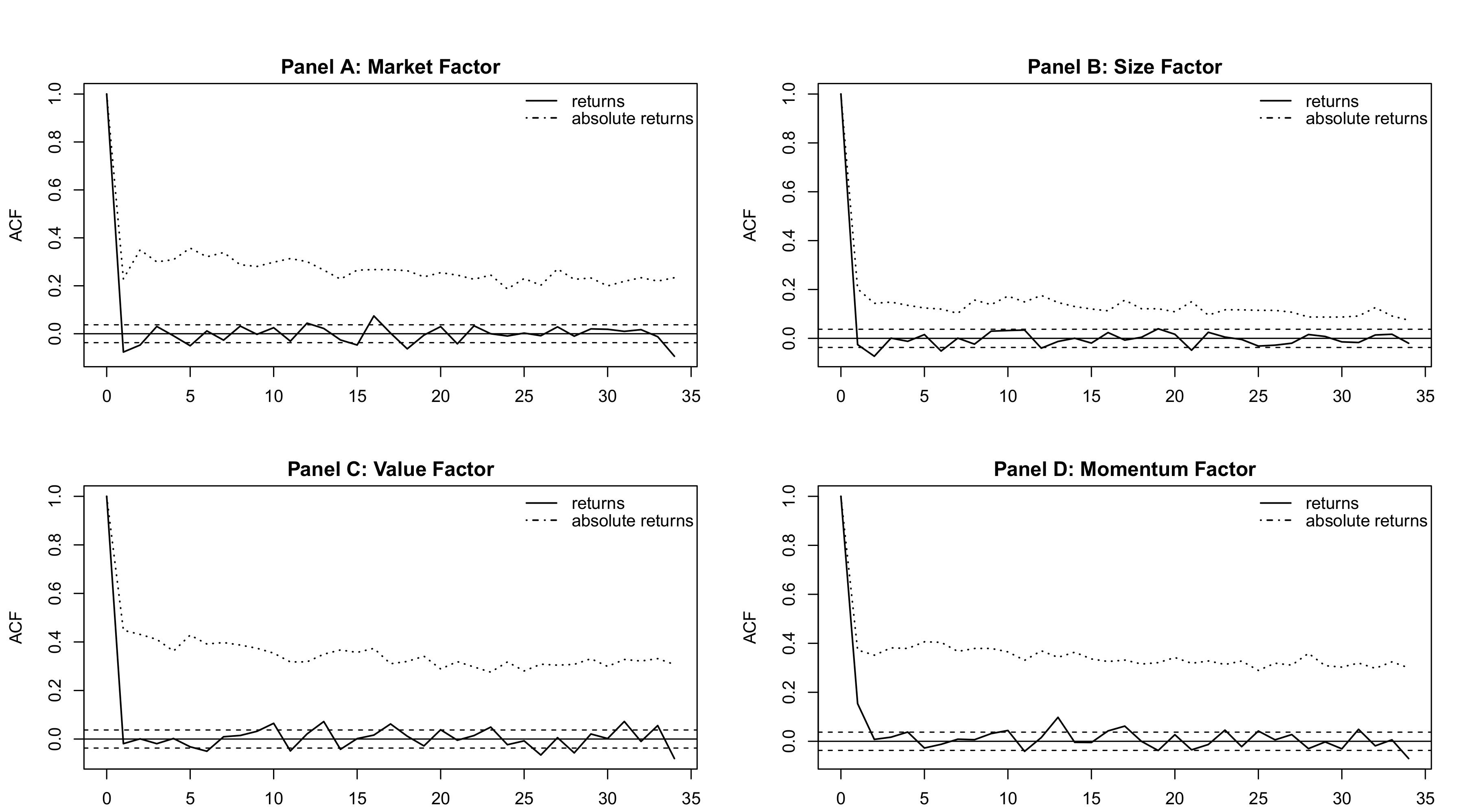 Figure 1 shows autocorrelation function (ACF) plots for the factors. The factors exhibit stronger autocorrelation in absolute returns than in the returns themselves, justifying the use of volatility models.