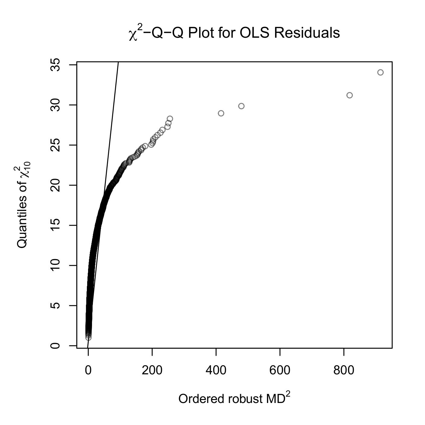 Figure 4 confirms the non-normality of OLS residuals, with the Q-Q plot showing clear deviations from the \(\chi^2\) reference line.