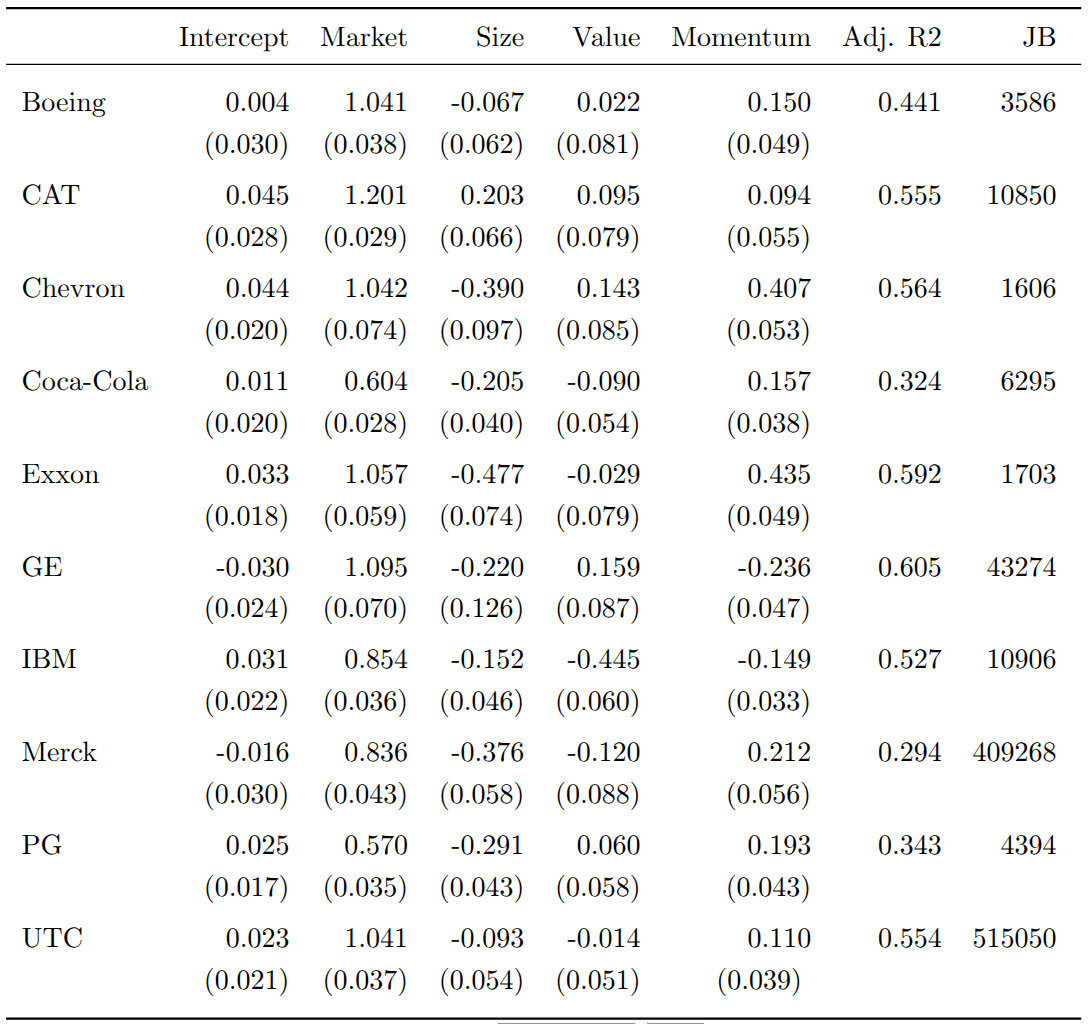 This reduces dimensionality by modeling only four factors instead of all portfolio constituents. The estimated Carhart parameters for our ten stocks are shown below. All market betas are close to one, adjusted \(R^2\) values range from 0.29 to 0.61, and the Jarque-Bera statistics overwhelmingly reject normality of the OLS residuals.