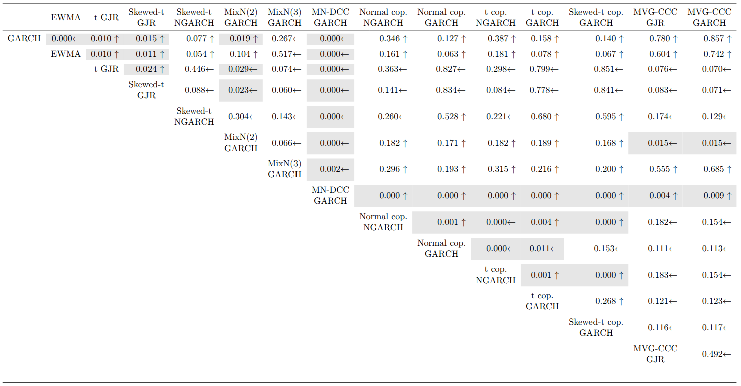 The CPA test results at the 1% VaR level show that the MN-DCC-GARCH is significantly outperformed by every other model. Most rejections occur in univariate vs. univariate or multivariate vs. multivariate comparisons. For multivariate models, factor copula-DCC models using skewed-t NGARCH marginals have significantly higher predictive ability than their counterparts with normal GARCH marginals. The normal copula is superior for skewed-t NGARCH marginals, but for normal GARCH marginals, the t and skewed-t copula versions significantly outperform the normal copula.
