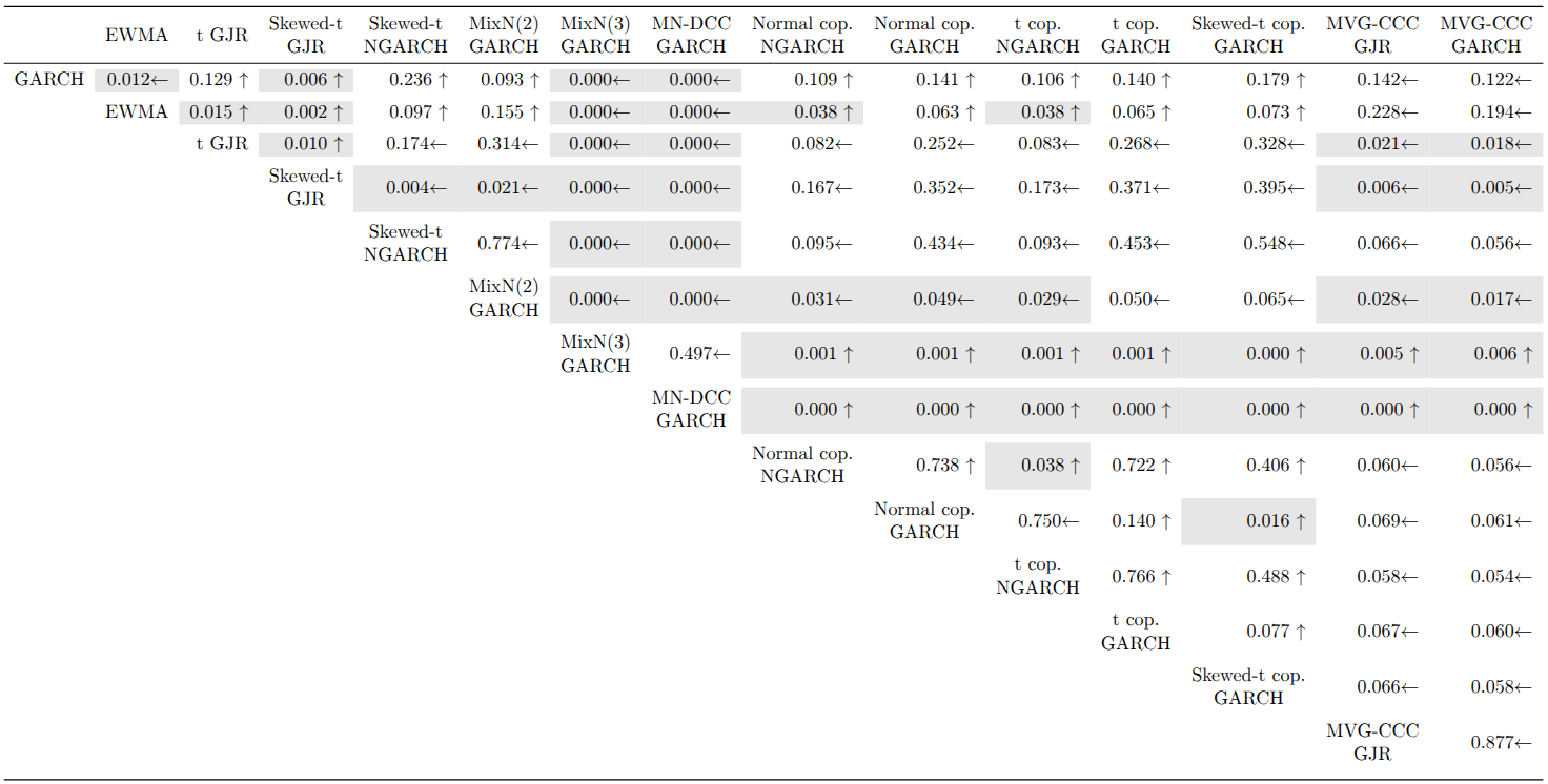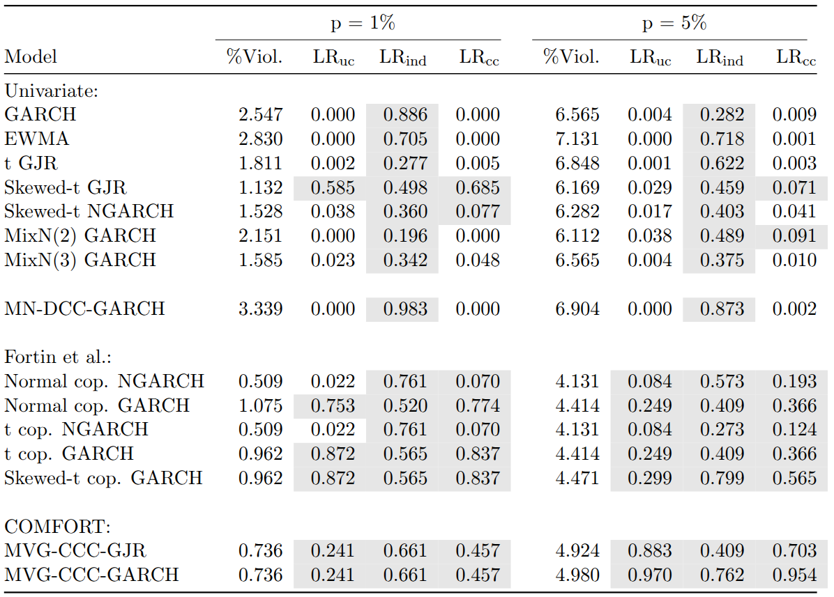 The backtest results are summarized in the table below. While all univariate models pass the likelihood ratio test of independence, only a few show adequate conditional or unconditional coverage. In particular, only the skewed-t GJR-GARCH passes the test of conditional coverage for both VaR levels. In contrast, most multivariate models pass all three likelihood ratio tests, with the exception of the multivariate normal (MN)-DCC-GARCH.