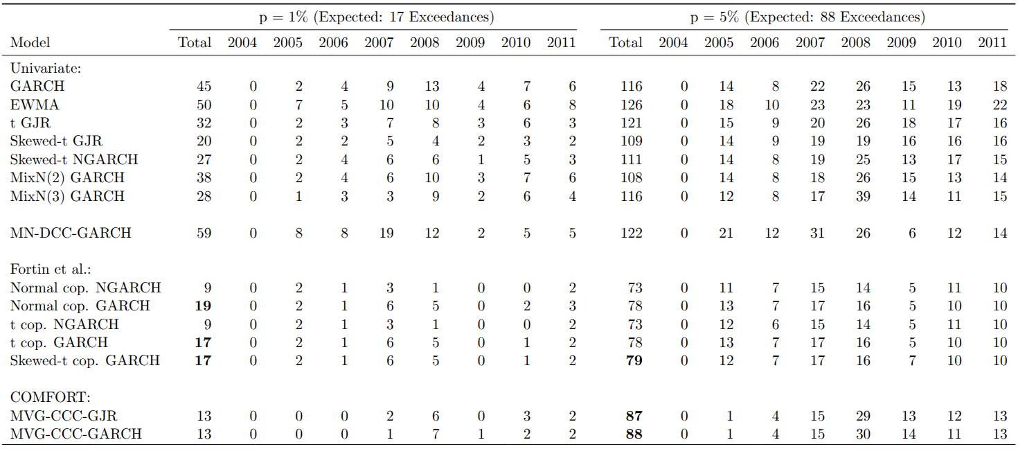 The table below shows the temporal distribution of exceedances. Nearly all exceedances for the COMFORT models occurred during or after the 2008 financial crisis, despite passing the independence test. At the 1% VaR level, Gaussian models without leverage effects have approximately three times as many exceedances as expected.