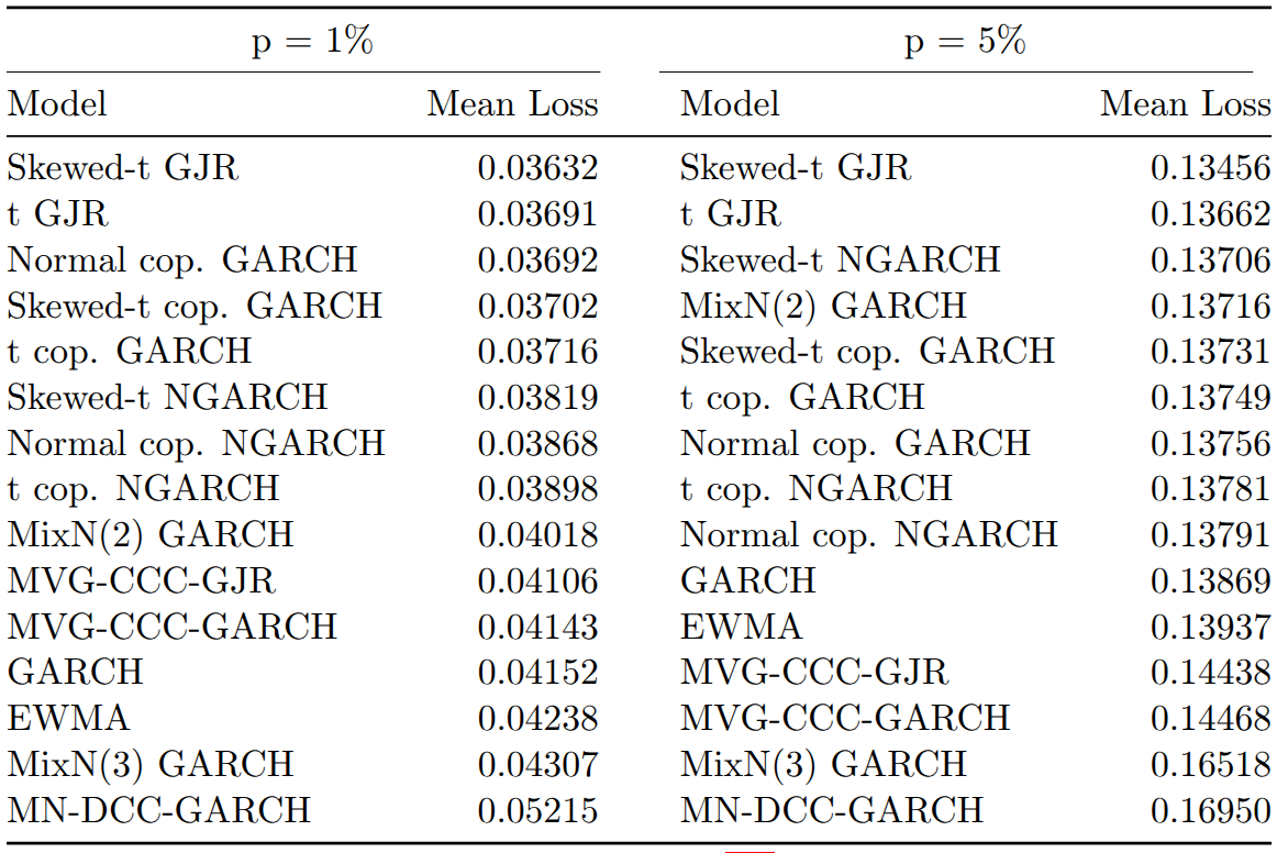 In terms of average tick loss, univariate models perform surprisingly well despite their suboptimal backtesting results. The skewed-t GJR model achieves the lowest and the MN-DCC-GARCH the highest average loss for both VaR levels. Multivariate models achieve better ranks at the 1% level than at the 5% level, with factor copula-based models showing lower average loss than COMFORT models at both levels.