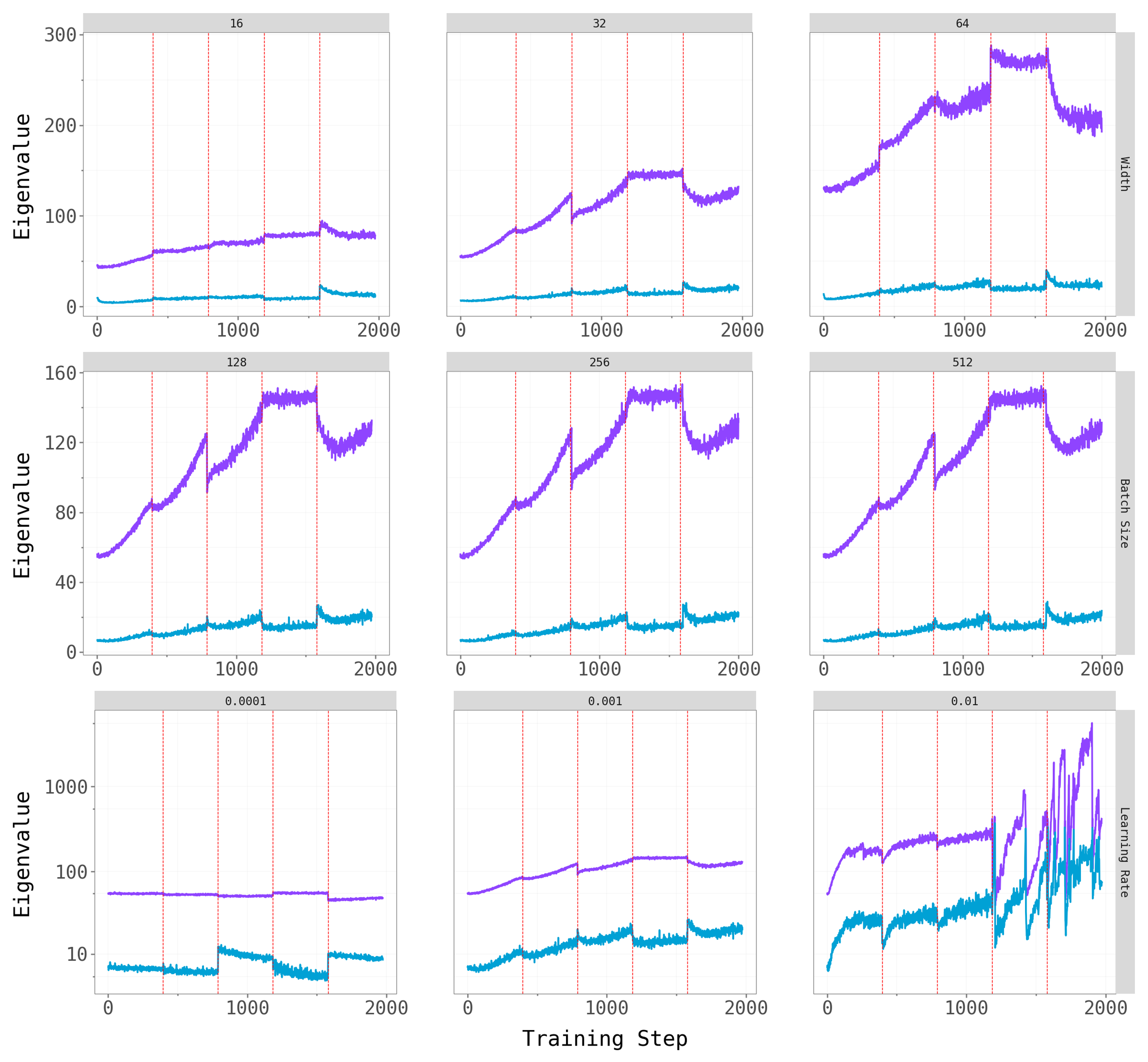 To check robustness, we vary key hyperparameters for CL-Bulk-SGD: network width (hidden units / output channels), batch size, and learning rate. The figures below show the top-\(k\) overlap trajectories and largest eigenvalue dynamics across these hyperparameter grids.