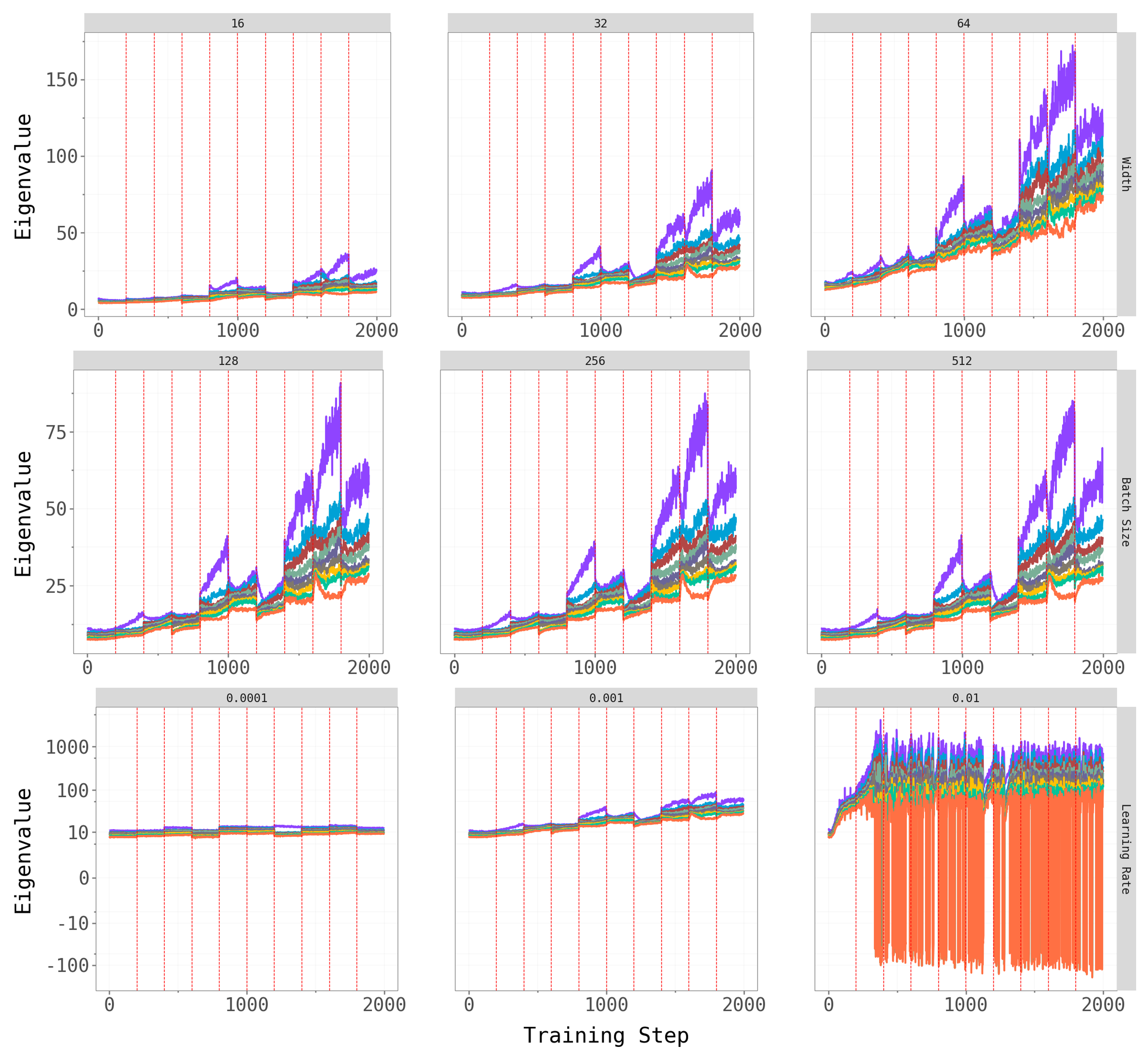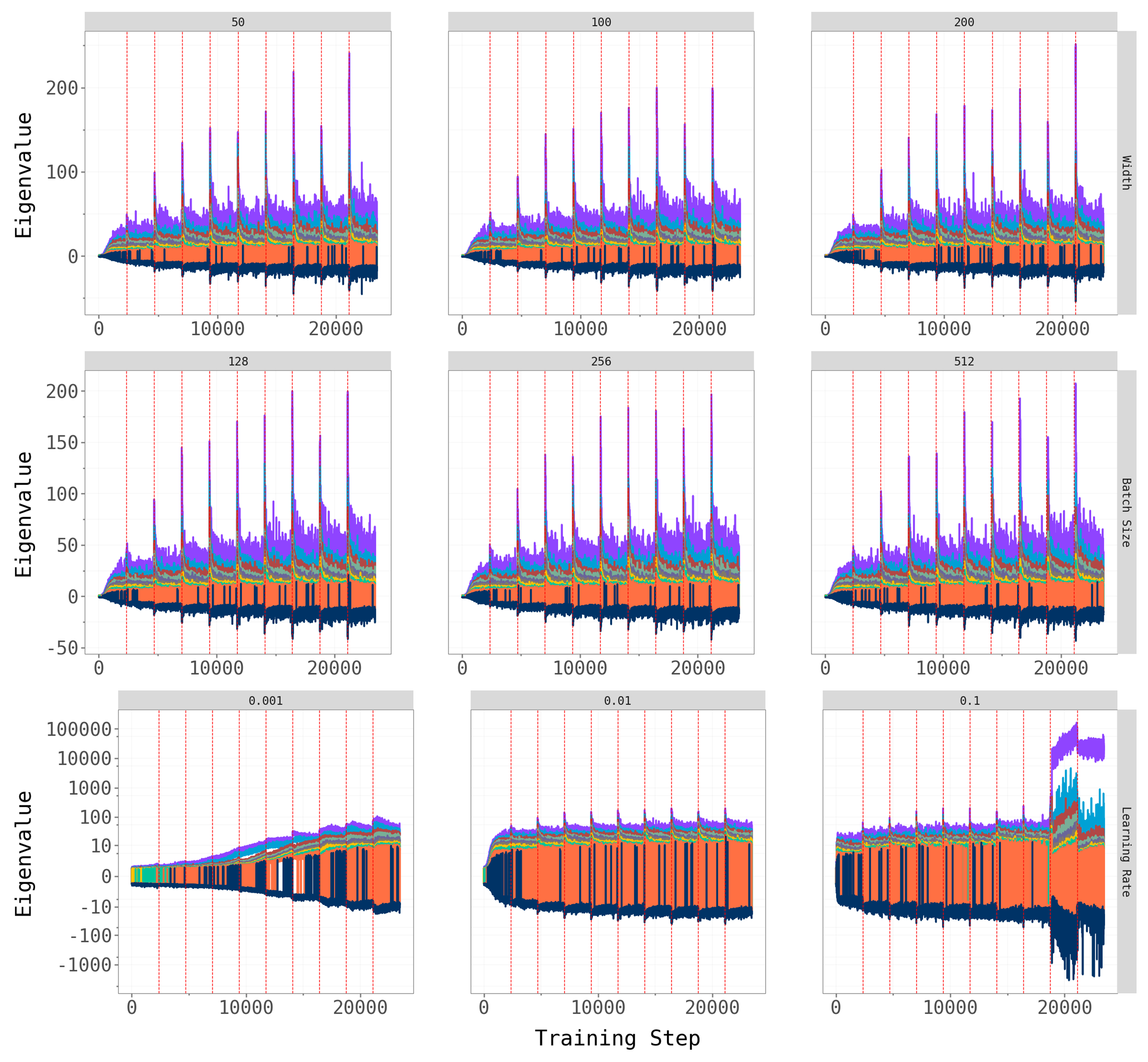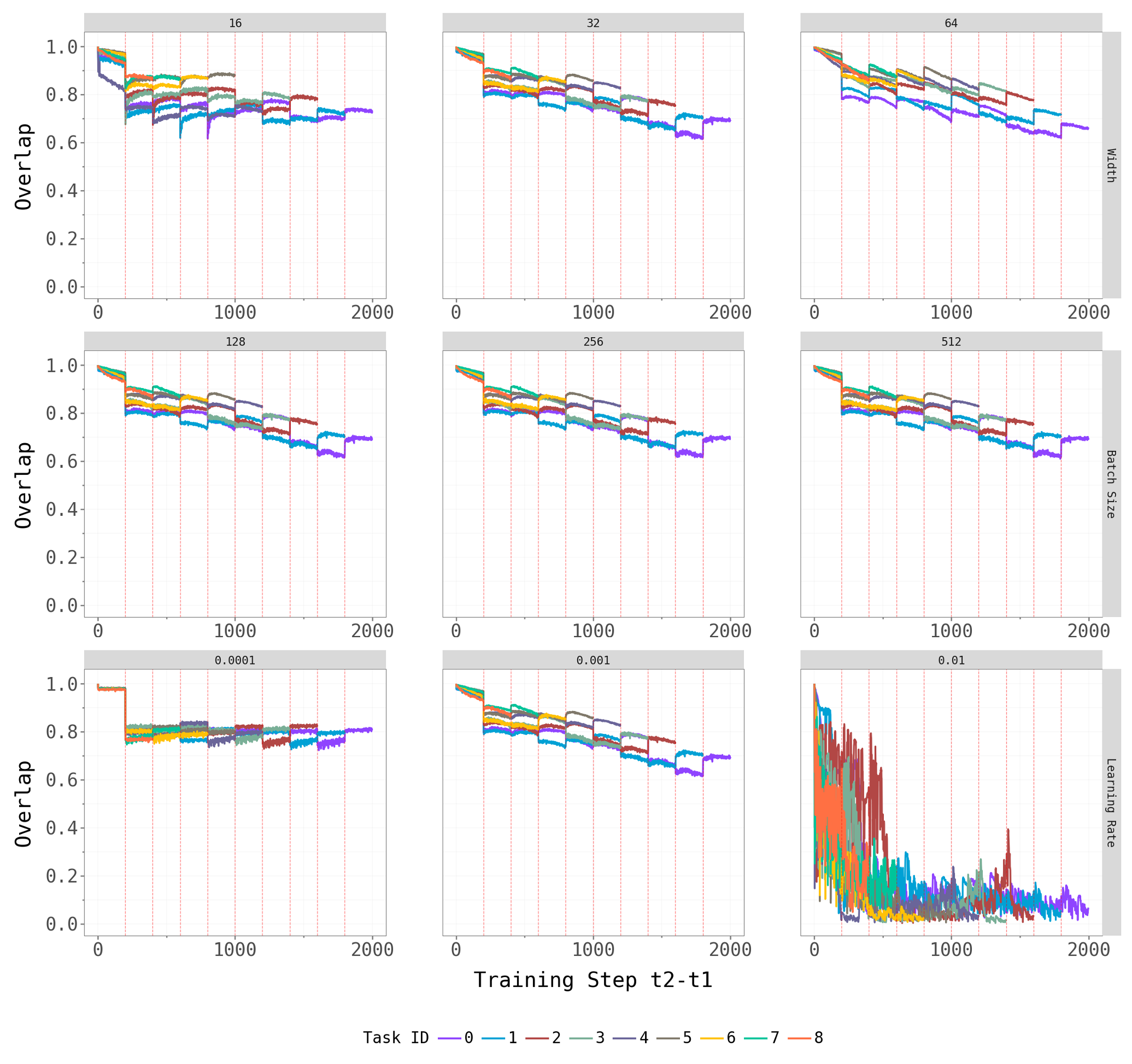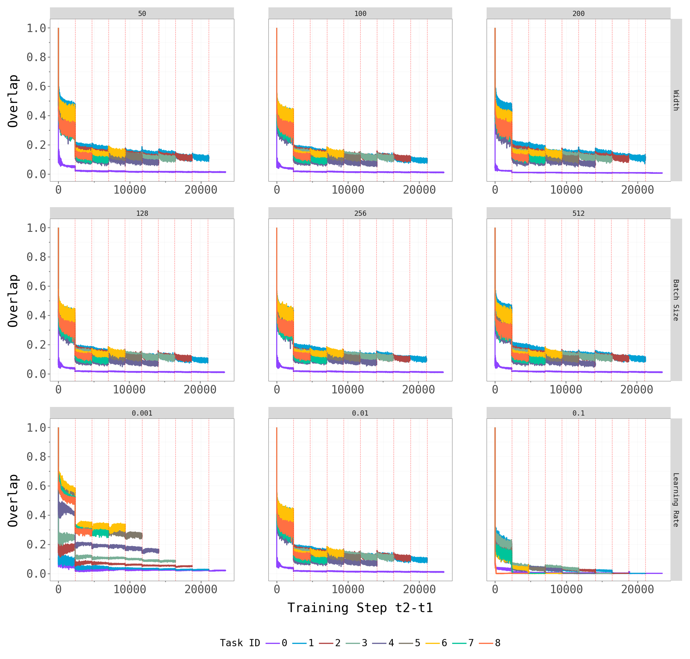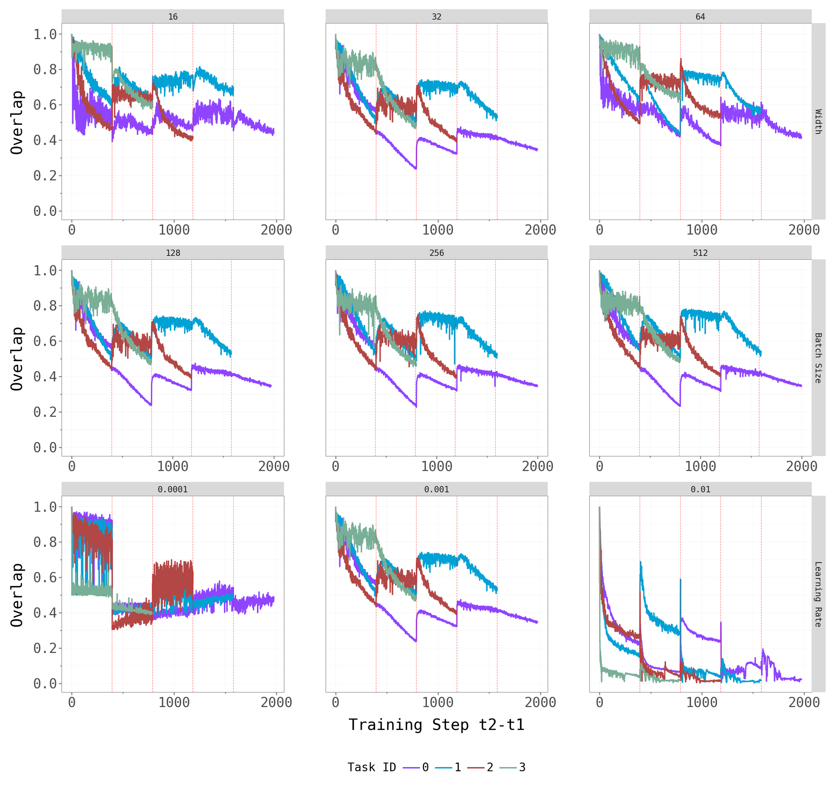Network width and batch size have at most a mild effect on the qualitative patterns — the dominant subspace still shifts at task transitions, and the spectral gap persists across architectures. Learning rate is the most influential hyperparameter: very small rates produce noisy, hard-to-interpret overlap trajectories (likely because the model does not fully converge within the 5-epoch budget), while moderate rates yield the cleaner dynamics we observe in the main experiments.