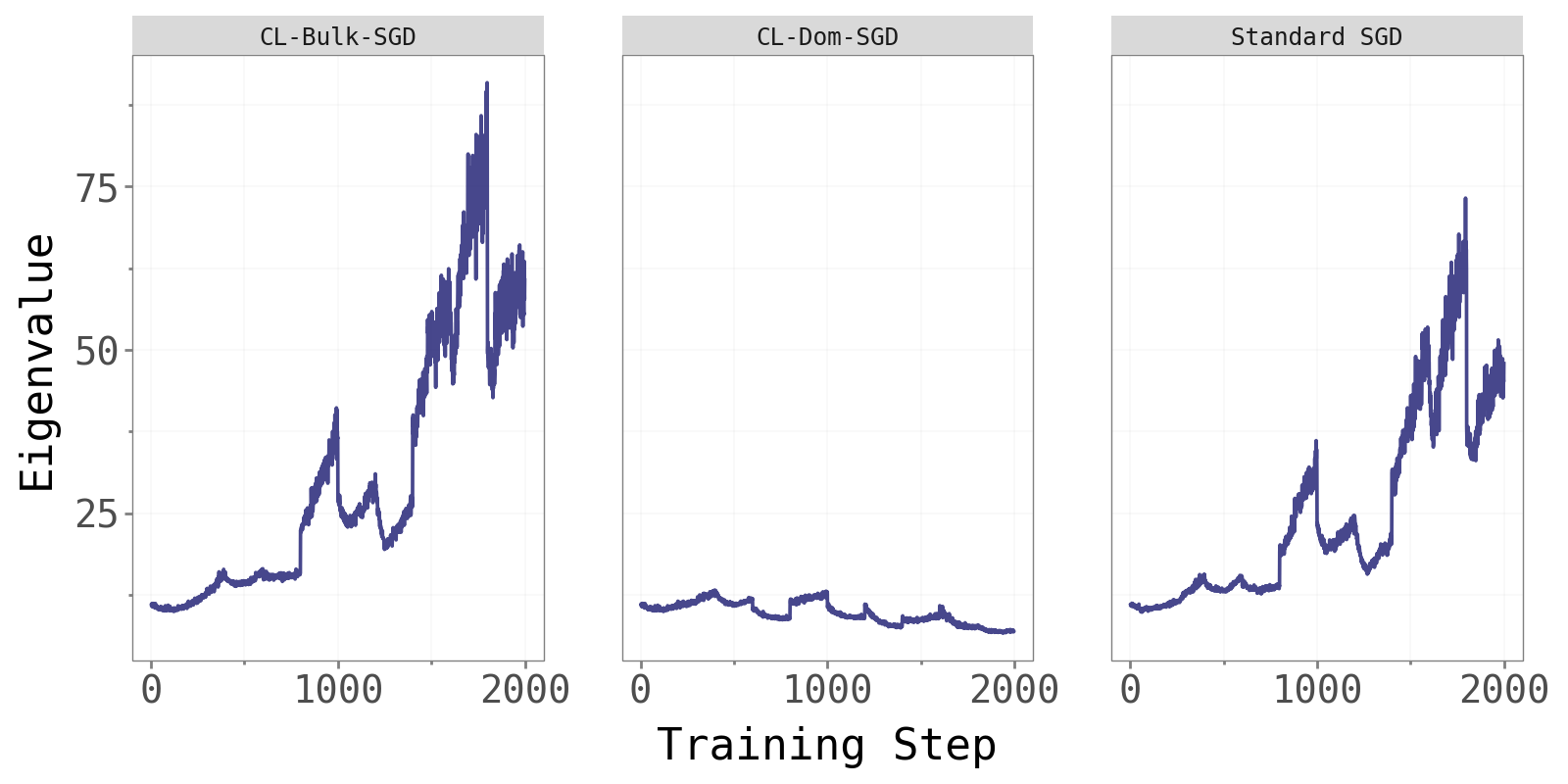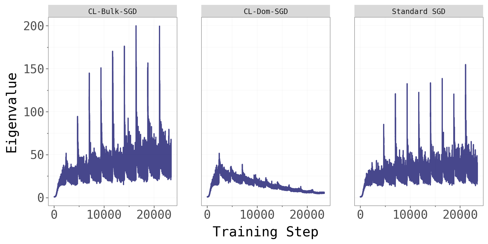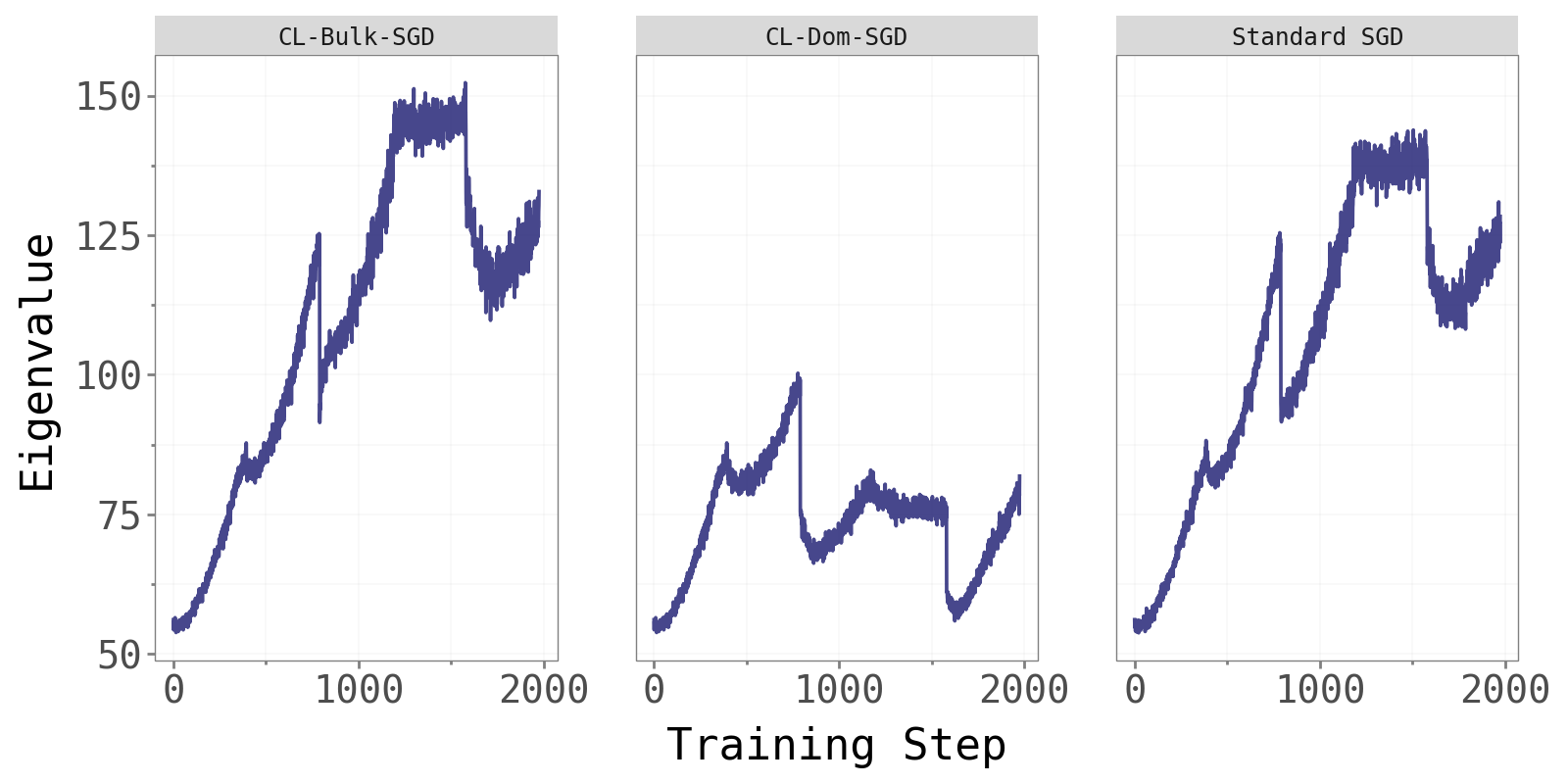 CL-Bulk-SGD and standard SGD maintain comparable, steadily increasing dominant eigenvalues throughout training — consistent with the edge-of-stability phenomenon noted in Cohen et al. (2022). CL-Dom-SGD shows noticeably different and more variable eigenvalue dynamics. Updating only in the dominant directions perturbs the curvature structure at every step, resulting in less stable Hessian behaviour. This is further evidence that the dominant subspace is not where effective learning naturally lives.