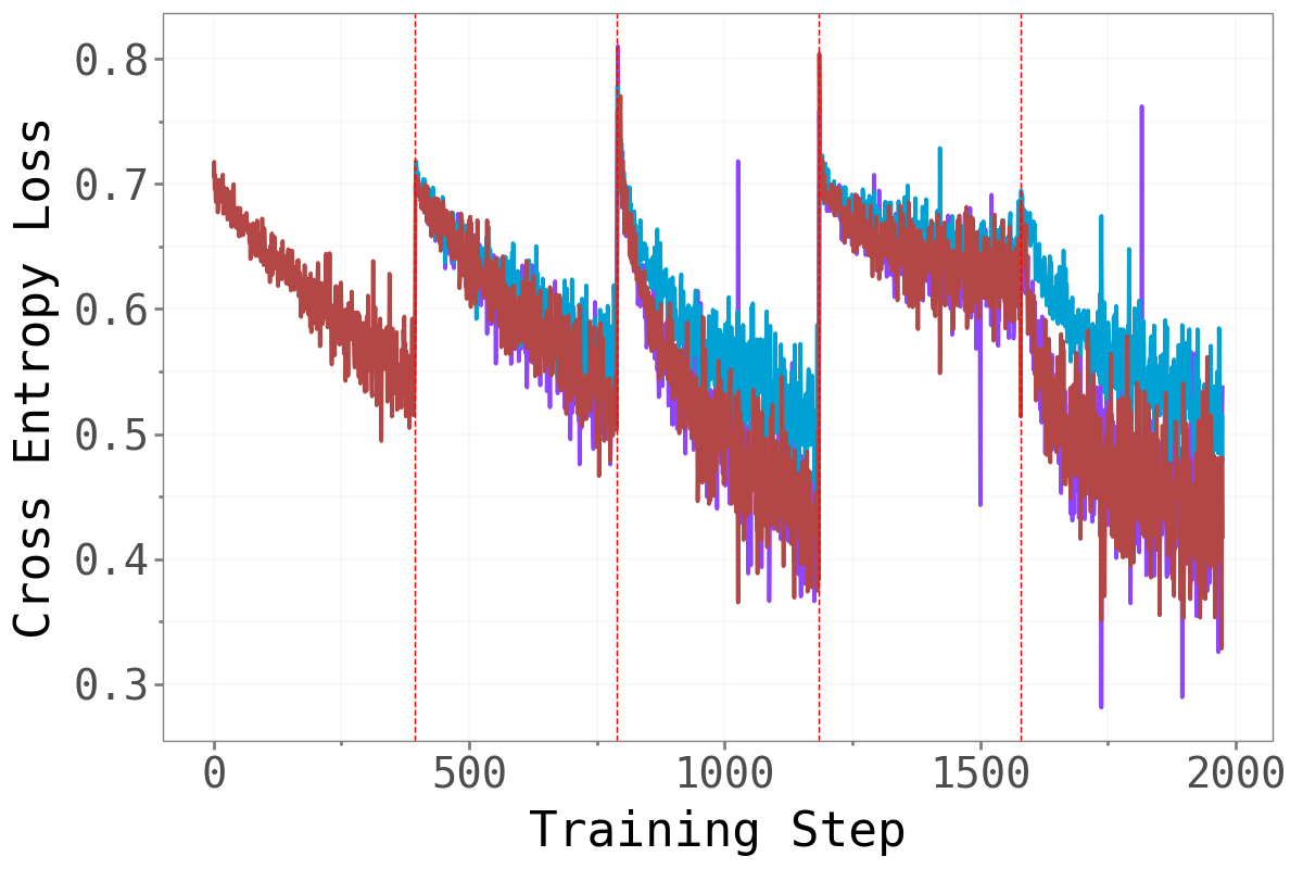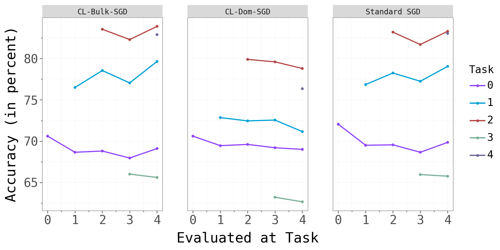 The figure below shows test accuracy per task, evaluated after each new task is trained. Each colored line tracks one task’s accuracy as later tasks are introduced.