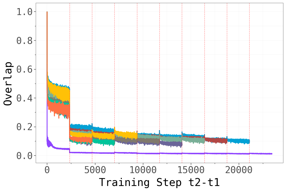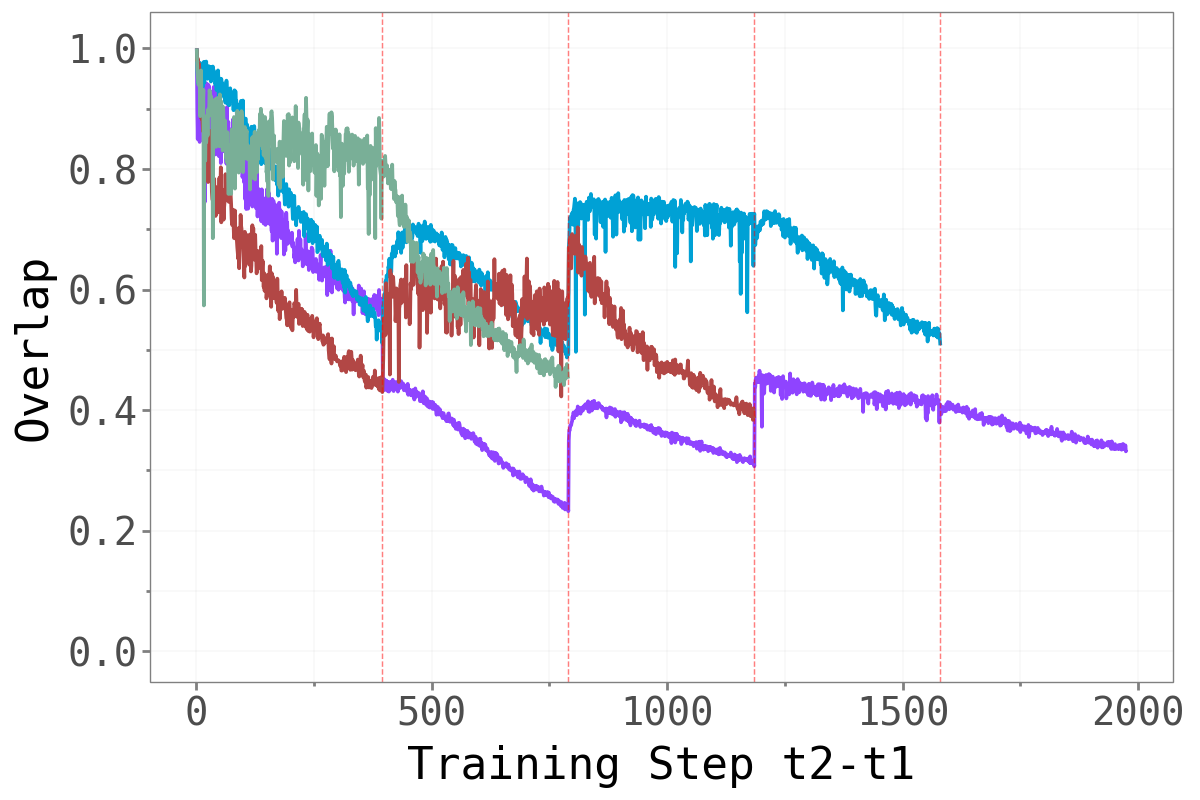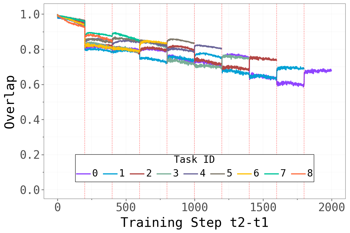 If forgetting is driven by changes in the dominant subspace, we would expect abrupt shifts in that subspace at task boundaries — old tasks’ sharp directions being replaced by new ones. The overlap metric quantifies this: a value close to 1 means the dominant subspace is essentially unchanged; a value close to 0 means it has rotated entirely.