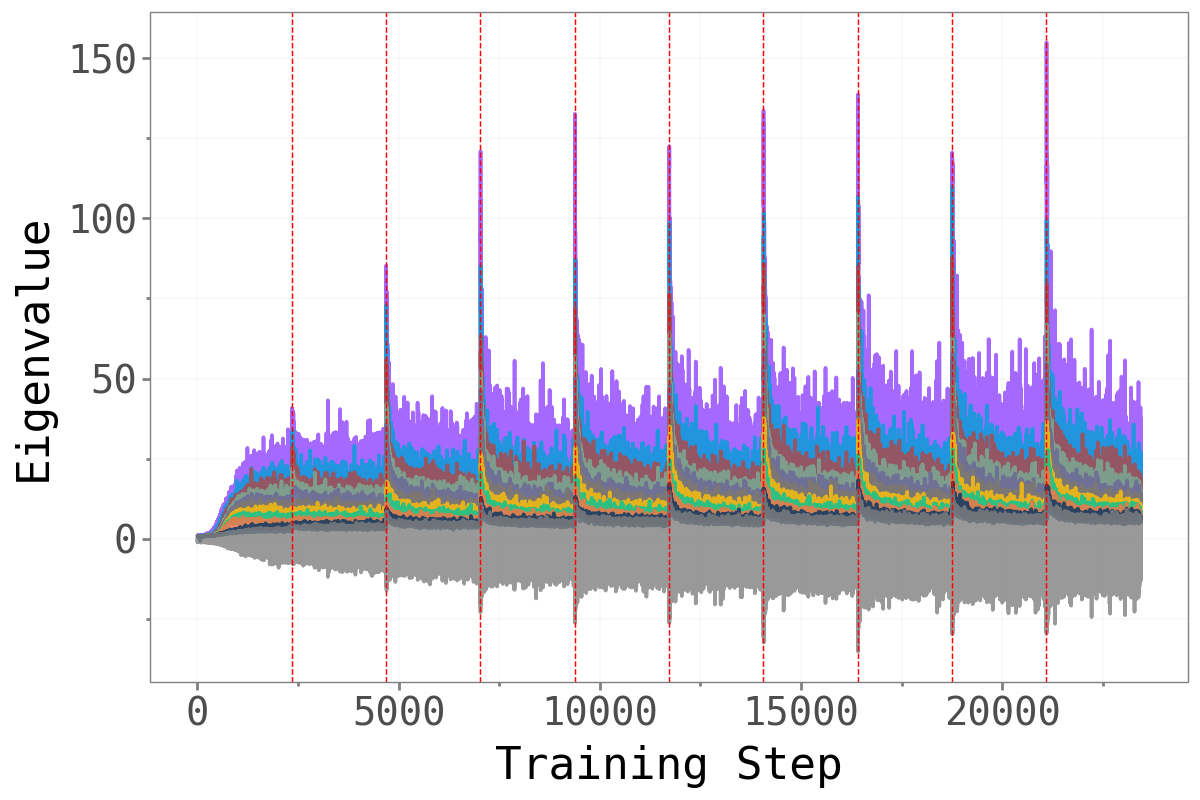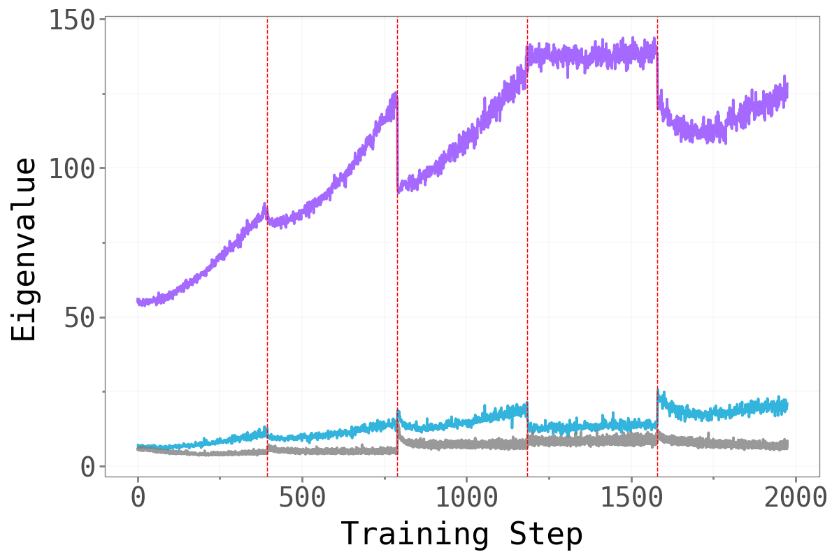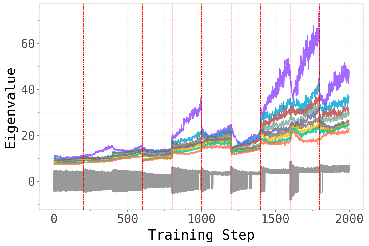 Before asking whether forgetting is localised in a particular subspace, we first confirm that the loss Hessian actually has a well-separated spectral structure. The figure below plots the top-\(k\) eigenvalues against the next-\(k\) eigenvalues across training, with red dashed lines marking task boundaries.