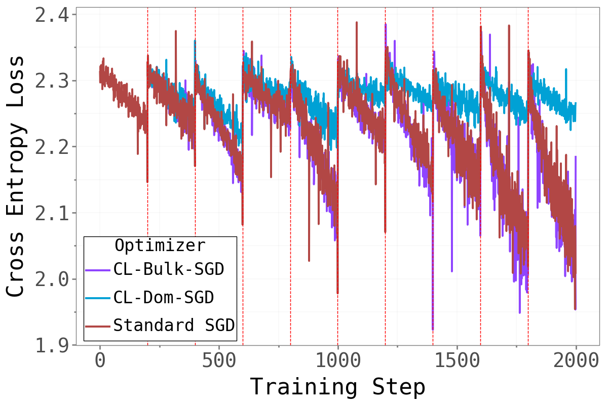 If learning requires the bulk, this constraint should substantially hurt performance. Conversely, since CL-Dom-SGD never touches the bulk, it should also preserve any knowledge stored there — so if forgetting happens in the bulk, this method should reduce it (possibly at the cost of learning less).