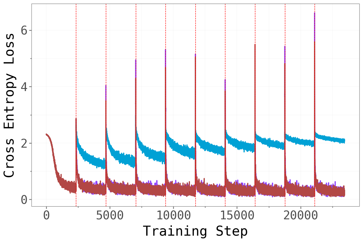 In continual learning, a model is trained on a sequence of tasks \(\tau_1, \tau_2, \ldots, \tau_T\) — each potentially drawn from a different data distribution — without access to past data when training on later tasks. The challenge is that gradient updates on task \(\tau_t\) tend to overwrite weights that were carefully tuned for earlier tasks, causing the model’s performance on \(\tau_1, \ldots, \tau_{t-1}\) to degrade. This is catastrophic forgetting (McCloskey and Cohen 1989; Goodfellow et al. 2013).