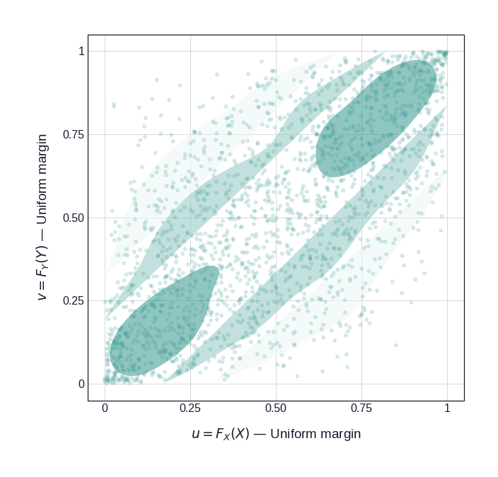 both of which are \(\mathrm{Uniform}(0,1)\) by construction. Their joint distribution is the copula: